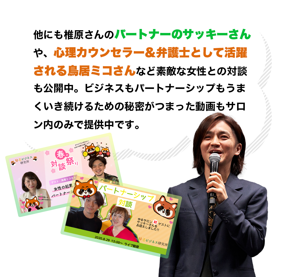 ゆるサロン限定動画はすごく勉強になる事ばかりで、ライブ配信では質問に答えていただいた事もあり、身近に感じられるのがいいと思います。ビジネスややりたい事に常にフォーカスできるようになったと思います。